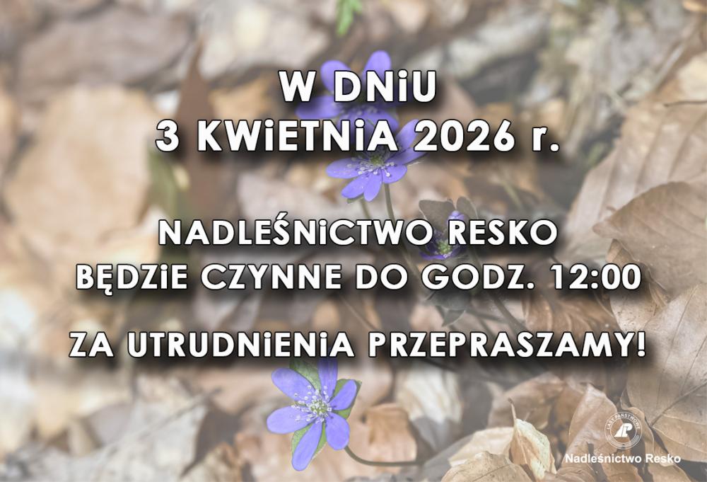 Informujemy, że w dniu 3 kwietnia 2026 r. Nadleśnictwo Resko będzie czynne do godziny 12:00.